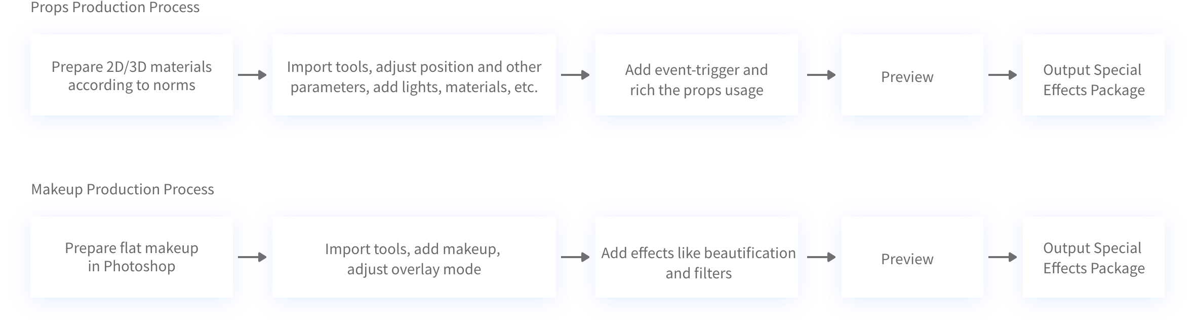 Support 2D props, 3D props, face deformation, face beauty, foreground special effects, portrait background style, trigger gameplay and other types of props, support users to make various types of props by themselves, and adjust the corresponding texture effects , bone physics and other parameters.