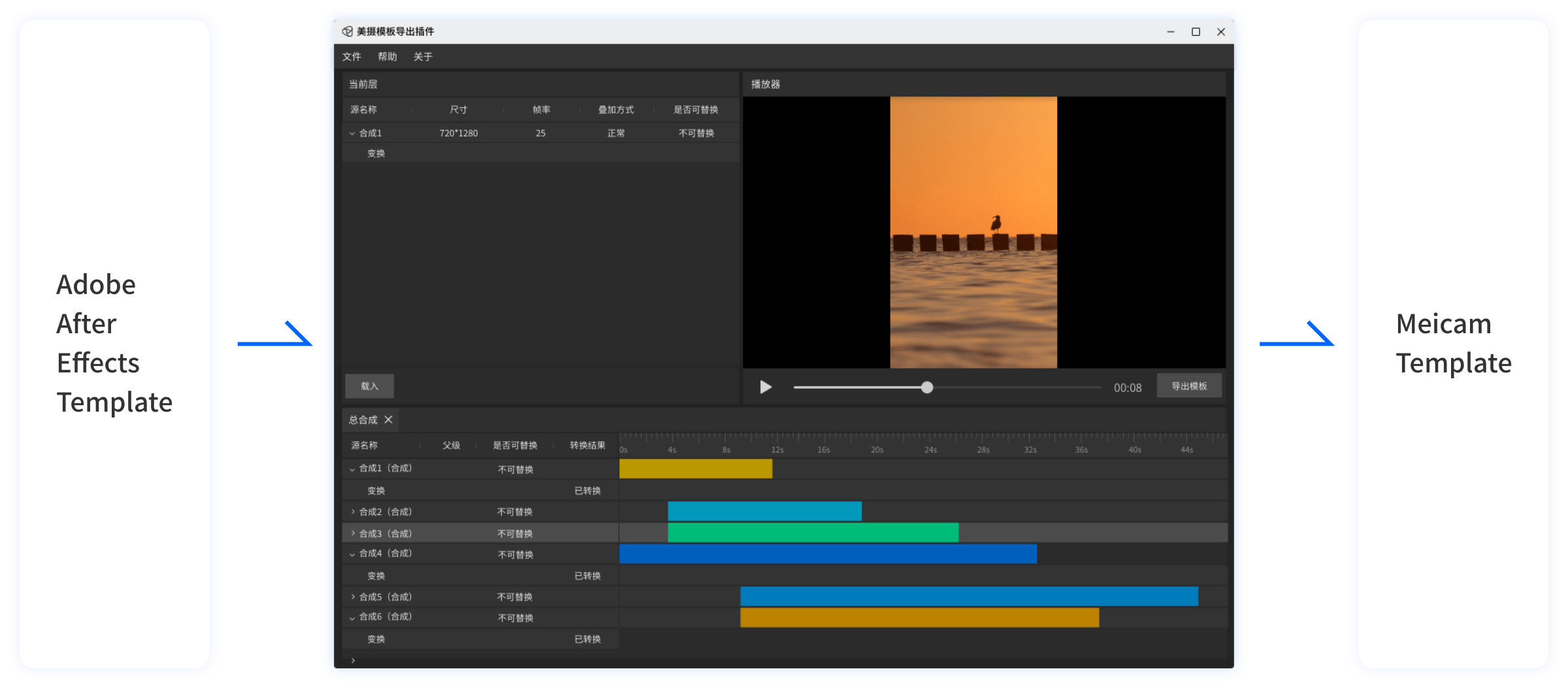 A plug-in tool created by combining the capabilities of Meishe SDK and Adobe After Effects, which can quickly create and convert Meishe AE conversion templates
